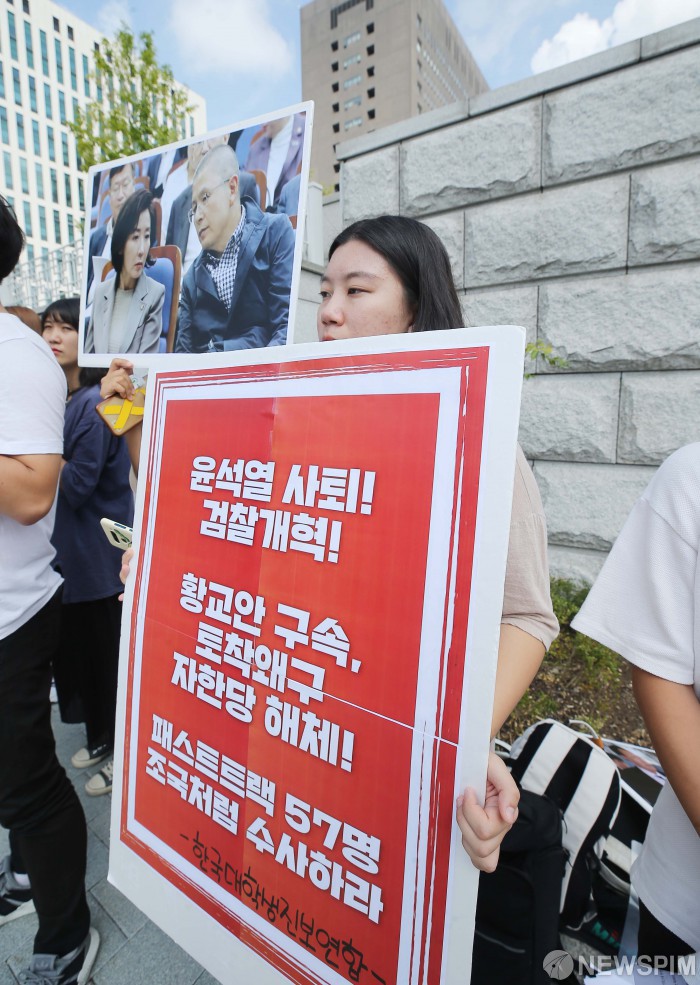 [서울=뉴스핌] 윤창빈 기자 = 4일 오후 서울 서초구 서울중앙지방검찰청 앞에서 한국대학생진보연합과 청년당이 청년학생 시국선언 기자회견을 열고 피켓을 들고 있다. 2019.10.04 pangbin@newspim.com