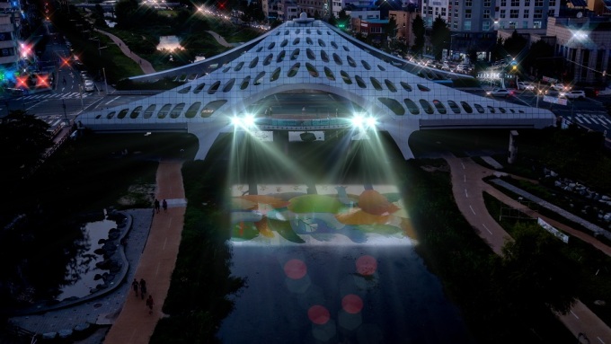| 대전시 중구 목척교 아래 대전천 수면에 영상이 상영되고 있다. [사진=대전시청] |