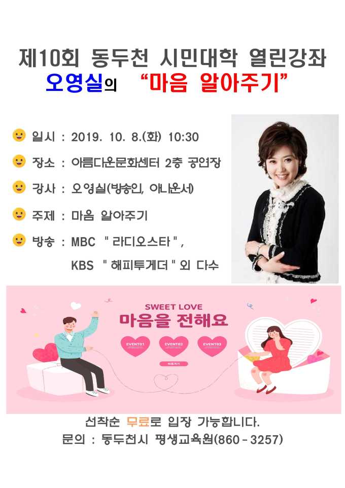 [동두천=뉴스핌] 양상현 기자 = 경기 동두천시는 오는 8일 오전 10시 30분에 아름다운문화센터 2층 공연장에서 방송인이자 전직 아나운서인 오영실 강사를 초청해 ‘마음 알아주기’라는 주제로 2019년 동두천시민대학 열 번째 열린강좌를 개최한다고 7일 밝혔다.