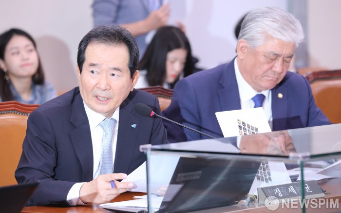 [서울=뉴스핌] 백인혁 기자 = 정세균 더불어민주당 의원(왼쪽)이 7일 오전 서울 여의도 국회에서 열린 문화체육관광위원회 문화재청 등에 관한 국정감사에서 질의하고 있다. 2019.10.07 dlsgur9757@newspim.com
