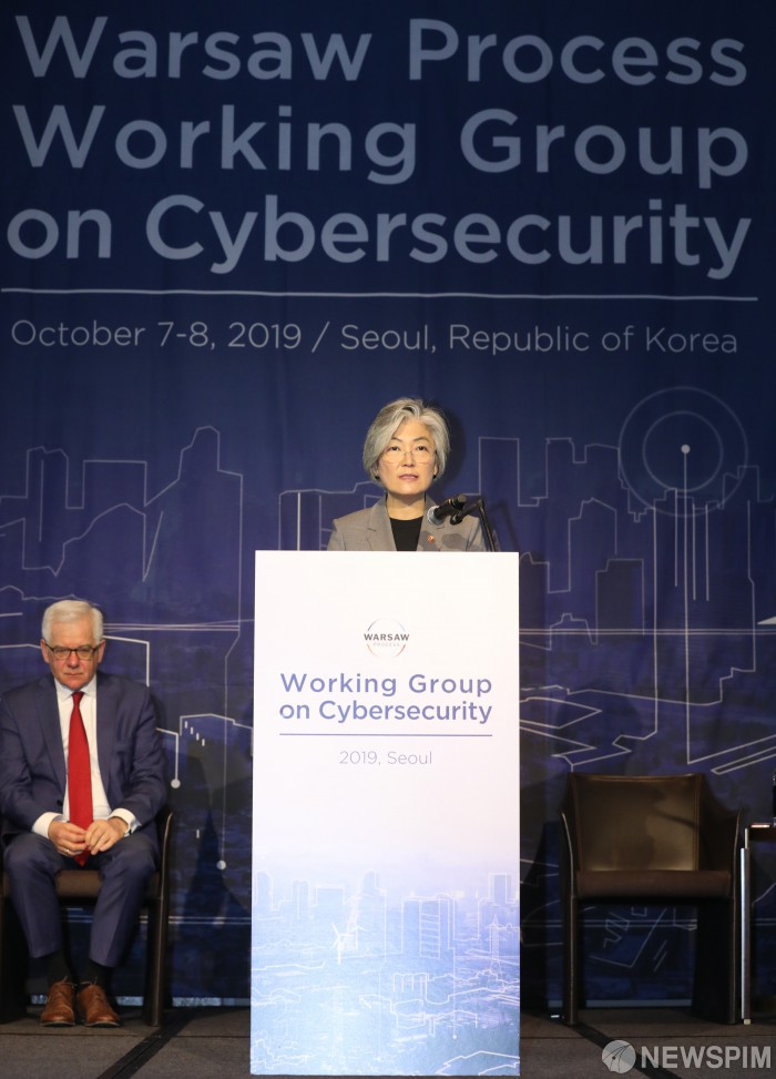 [서울=뉴스핌] 백인혁 기자 = 강경화 외교부 장관이 8일 오전 서울 종로구 포시즌스 호텔에서 열린 바르샤바 프로세스 사이버안보 작업반 회의에서 인사말을 하고 있다. 2019.10.08 dlsgur9757@newspim.com