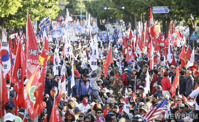 [서울=뉴스핌] 이한결 기자 = 9일 오후 서울 종로구 광화문광장에서 문재인하야 범국민투쟁본부 주최로 열린 ‘문재인 탄핵 10.9 천만 국민대회’에서 참석자들이 세종로에 자리를 잡고 있다. 이날 집회에서는 조국 법무부 장관 퇴진과 문재인 대통령 하야 등을 촉구했다. 2019.10.09 alwaysame@newspim.com