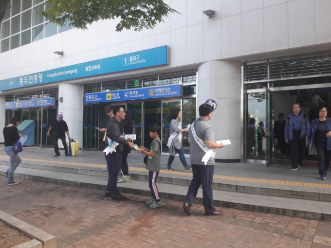 | 동두천시선거관리위원회가 동두천중앙역 앞에서 주권의식 홍보 캠페인을 실시하고 있다.[사진=동두천시선거관리위원회] |