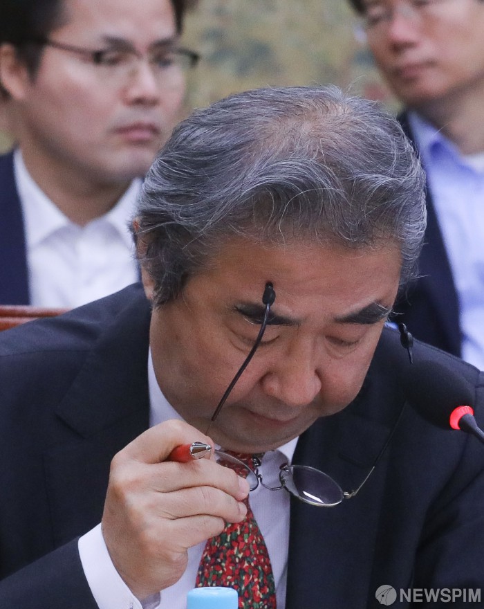 [서울=뉴스핌] 최상수 기자 = 이홍식 한국도박문제관ㅁ센터 원장이 10일 오전 서울 여의도 국회 문화체육관광위원회에서 열린 사행산업통합감독위원회, 한국관광공사 등에 대한 국정감사에서 안경을 고쳐쓰고 있다. 2019.10.10 kilroy023@newspim.com