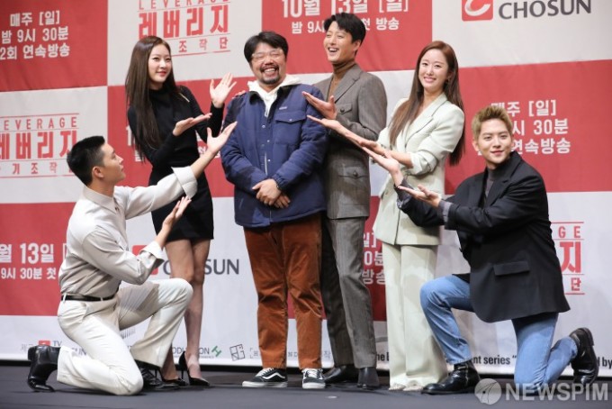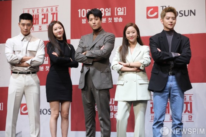 韩国TV朝鲜新剧《Leverage:诈骗操作团》制作发布会10日在首尔举行,主演李东健、全慧彬、金赛纶、金权和吕会铉出席。