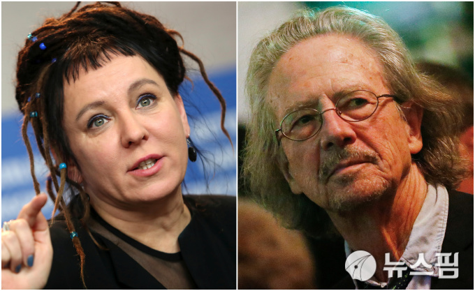 [베를린 로이터=뉴스핌] 김근철 기자=스웨덴 왕립과학원 노벨위원회가 10일(현지시간) 지난해와 올해 노벨 문학상 수상자로 각각 선정한 폴란드 작가 올가 토카르추크(왼쪽)와 오스트리아 희곡작가 페터 한트케. 2019.10.10.