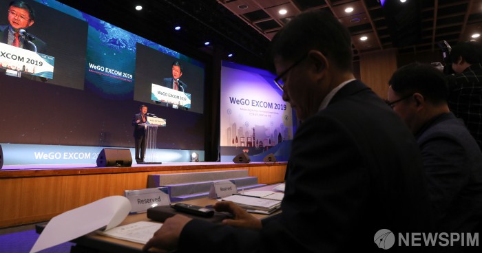 [성남=뉴스핌] 최상수 기자 = 이경렬 세계스마트시티기구 사무총장이 14일 오전 성남시 분당구 경기창조경제혁신센터에서 열린 세계스마트시티기구 집행위원회 회의(WeGO EXCOM 2019)에서 인사말을 하고 있다. 2019.10.14 kilroy023@newspim.com