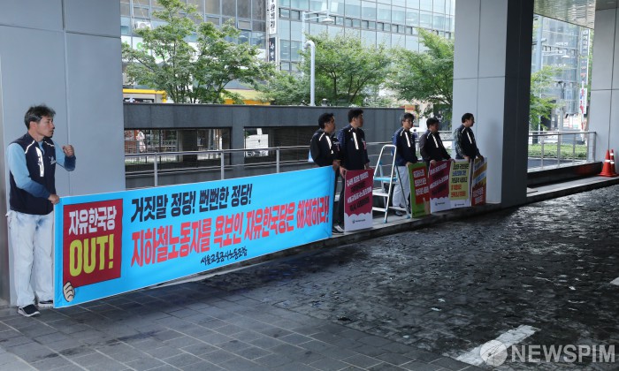 [서울=뉴스핌] 백인혁 기자 = 14일 오전 국회 행정안전위원회 서울시 국정감사가 열릴 예정인 서울시청 앞에서 서울교통공사노조가 채용비리 주범으로 서울교통공사 노조를 매도한 자유한국당을 규탄하는 시위를 벌이고 있다. 2019.10.14 dlsgur9757@newspim.com