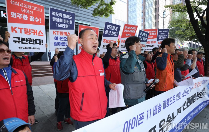 [서울=뉴스핌] 백인혁 기자 = 민주노총 서비스연맹 서비스일반노동조합 회원들이 22일 오전 서울 종로구 광화문 KT사옥 앞에서 KT핸드폰 운송노동자 전면파업 선포 기자회견을 열고 구호를 외치고 있다. 2019.10.22 dlsgur9757@newspim.com