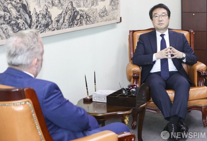 [서울=뉴스핌] 이한결 기자 = 이도훈 외교부 한반도평화교섭본부장이 23일 오전 서울 종로구 정부서울청사 별관 외교부에서 켄트 헤르스테트 스웨덴 외교부 한반도특사와 면담을 하고 있다. 2019.10.23 alwaysame@newspim.com
