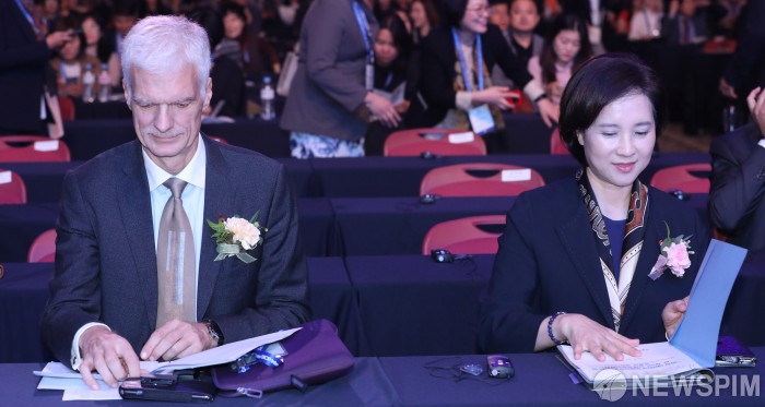 [고양=뉴스핌] 백인혁 기자 = 유은혜 부총리 겸 교육부 장관(오른쪽)과 안드레아스 슐라이허 OECD 교육국장이 23일 오전 경기도 고양시 킨텍스 제2전시장에서 열린 한-OECD 국제교육컨퍼런스 2019 대한민국 미래교육 한마당 개막식에 참석해 자료를 살펴보고 있다. 2019.10.23 dlsgur9757@newspim.com