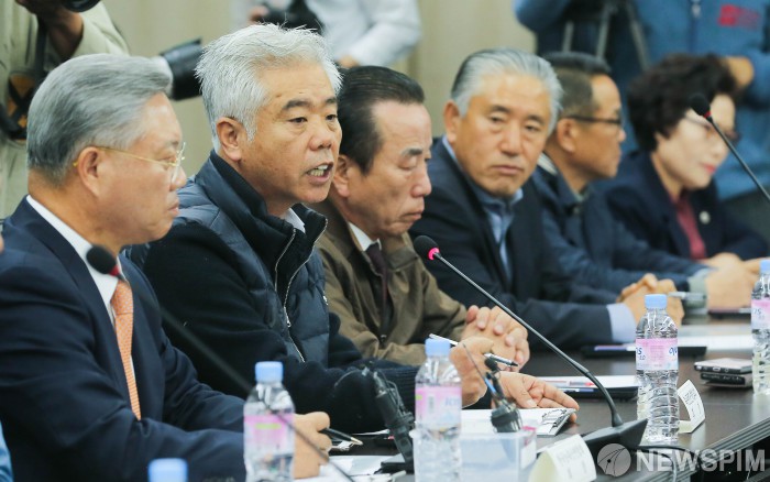 [서울=뉴스핌] 윤창빈 기자 = 김홍길 축산관련단체협의회 회장이 24일 오전 서울 여의도 나라키움 여의도빌딩에서 열린 민관합동 농업계 간담회에서 모두발언을 하고 있다. 2019.10.24 pangbin@newspim.com