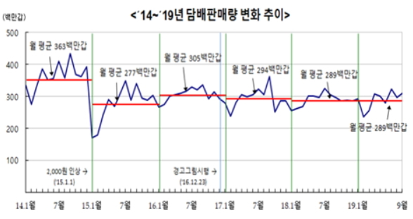 2019년도 9월까지 누적판매량은 26억갑으로 전년동기(26억1000만갑)과 비교해 0.4% 감소해 담뱃값 인상 후 담배 판매량은 감소세를 유지하고 있다.
