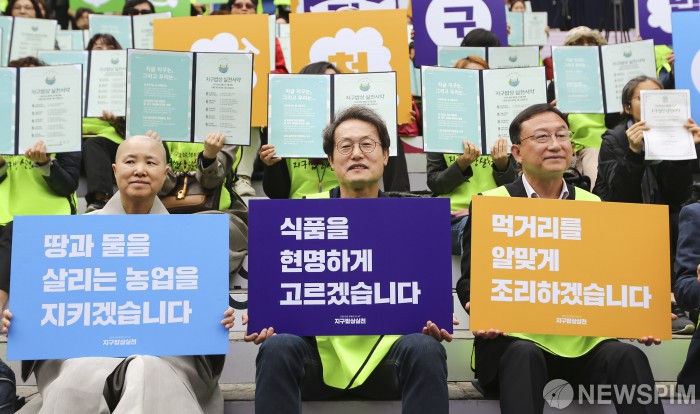 [서울=뉴스핌] 이한결 기자 = 조희연 서울시교육감이 28일 오후 서울 종로구 세종문화회관 중앙계단에서 열린 '건강한 밥상 행복한 지구, 지구밥상 실천 서약식'에서 참석자들과 함께 서약서를 들어보이는 퍼포먼스를 펼치고 있다. 2019.10.28 alwaysame@newspim.com