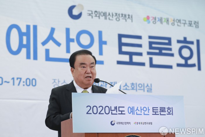 [서울=뉴스핌] 이형석 기자 = 문희상 국회의장이 28일 오후 서울 여의도 국회 의원회관에서 열린 2020년도 예산안 토론회에서 격려사를 하고 있다. 2019.10.28 leehs@newspim.com