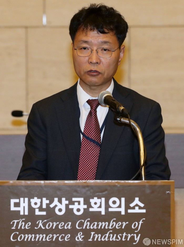 [서울=뉴스핌] 정일구 기자 = 김용래 산업통상자원부 통상차관보가 29일 오후 서울 중구 대한상공회의소에서 열린 '한미 소재·부품·장비 국제협력 세미나'에서 축사를 하고 있다. 2019.10.29 mironj19@newspim.com