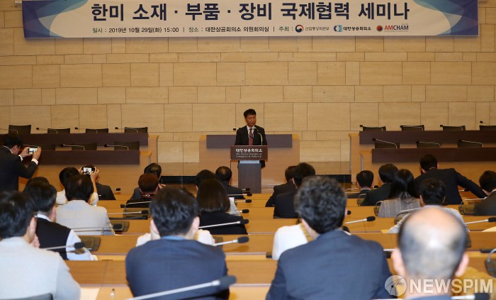 [서울=뉴스핌] 정일구 기자 = 김용래 산업통상자원부 통상차관보가 29일 오후 서울 중구 대한상공회의소에서 열린 '한미 소재·부품·장비 국제협력 세미나'에서 축사를 하고 있다. 2019.10.29 mironj19@newspim.com