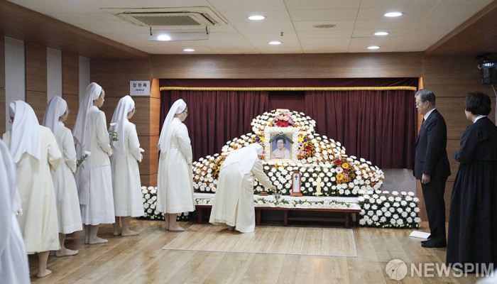 [부산=뉴스핌] 30일 오전 부산 남천성당에 마련된 문재인 대통령의 모친 고 강한옥 여사의 빈소에 부산성베네딕도수녀원 수녀님들이 고인의 영정에 헌화하고 있다. [사진=청와대] 2019.10.30. photo@newspim.com