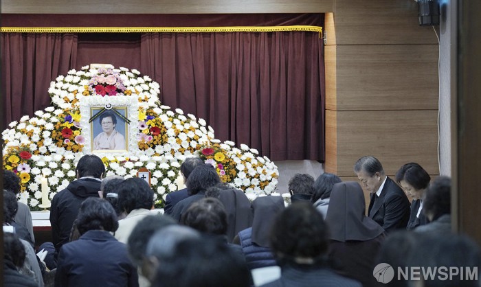 [부산=뉴스핌] 문재인 대통령과 김정숙 여사가 30일 오전 부산 남천성당에 마련된 고 강한옥 여사의 빈소에서 생전 고인이 다니던 성당의 교우들과 연미사를 드리고 있다. [사진=청와대] 2019.10.30. photo@newspim.com