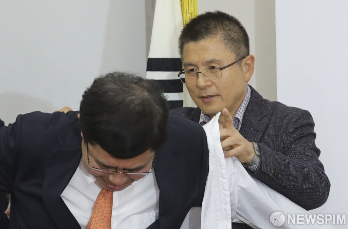 [서울=뉴스핌] 최상수 기자 = 황교안 자유한국당 대표가 31일 오전 서울 여의도 국회에서 열린 제1차 영입인재 환영식에서 윤창현 서울시립대 교수에게 당복을 입혀주고 있다. 2019.10.31 kilro0y23@newspim.com