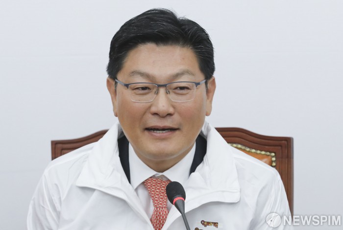 [서울=뉴스핌] 최상수 기자 = 김성원 전 두산중공업 부사장이 31일 오전 서울 여의도 국회에서 열린 제1차 자유한국당 영입인재 환영식에서 인사말을 하고 있다. 2019.10.31 kilro0y23@newspim.com