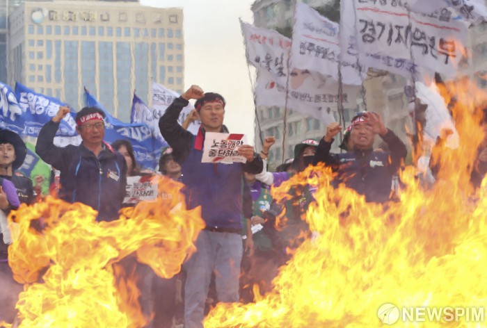 [서울=뉴스핌] 이한결 기자 = 31일 오후 서울 여의도 국회의사당역 3번 출구 앞에서 열린 '민주노총 결의대회'에서 전국민주노동조합총연맹 조합원들이 '노조파괴법, 임금삭감, 장시간 노동 분쇄 퍼포먼스'를 선보이고 있다. 이날 조합원들은 노동개악 분쇄, 탄력근로제 기간확대 저지를 요구했다. 2019.10.31 alwaysame@newspim.com