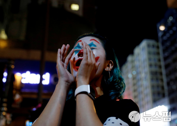 | [홍콩 로이터=뉴스핌] 최원진 기자= 조커로 분장한 홍콩의 반정부 시위자 여성이 경찰서 앞에서 소리 치고 있다. 2019.10.31. |