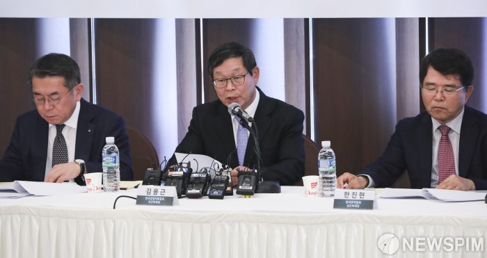 [서울=뉴스핌] 이한결 기자 = 김용근 한국경영자총협회 상근부회장이 6일 오전 서울 중구 프레스센터에서 열린 '주요 경제관련법의 조속 입법화를 촉구하는 경제계 입장' 기자회견에서 발언을 하고 있다. 왼쪽부터 김준동 대한상공회의소 상근부회장, 김용근 경총 상근부회장, 한진현 한국무역협회 상근부회장. 2019.11.06 alwaysame@newspim.com