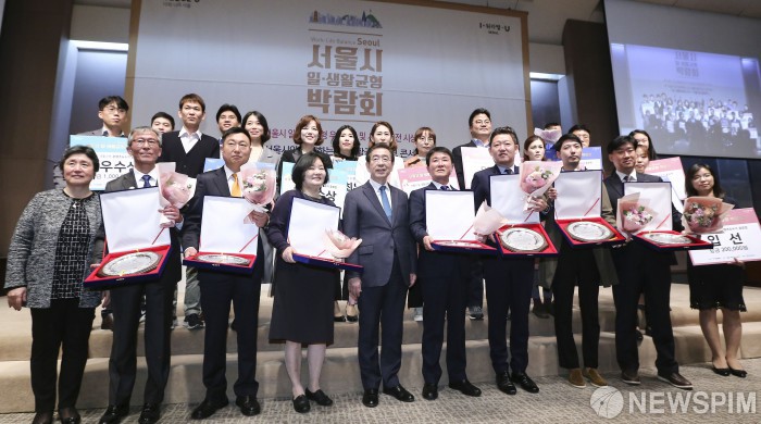 [서울=뉴스핌] 이한결 기자 = 박원순 서울시장이 6일 오전 서울 중구 프레스센터에서 열린 서울시 일·생활균형 박람회 1부 '일·생활균형 우수기업 및 시민공모전 시상식 & 토크콘서트'에서 우수기업과 콘텐츠&수기 공모전 수상자들과 함께 기념촬영을 하고 있다. 2019.11.06 alwaysame@newspim.com