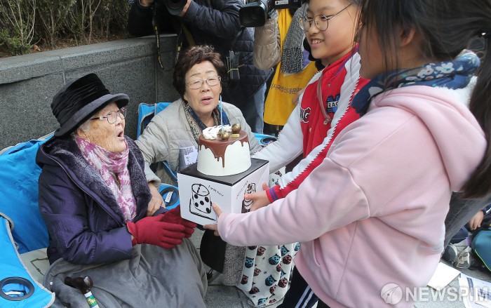 [서울=뉴스핌] 윤창빈 기자 = 생일을 맞은 이옥선 할머니(왼쪽)가 6일 오전 서울 종로구 옛 일본대사관 앞에서 열린 제1412차 정기수요집회에서 케이크의 촛불을 불고 있다. 2019.11.06 pangbin@newspim.com
