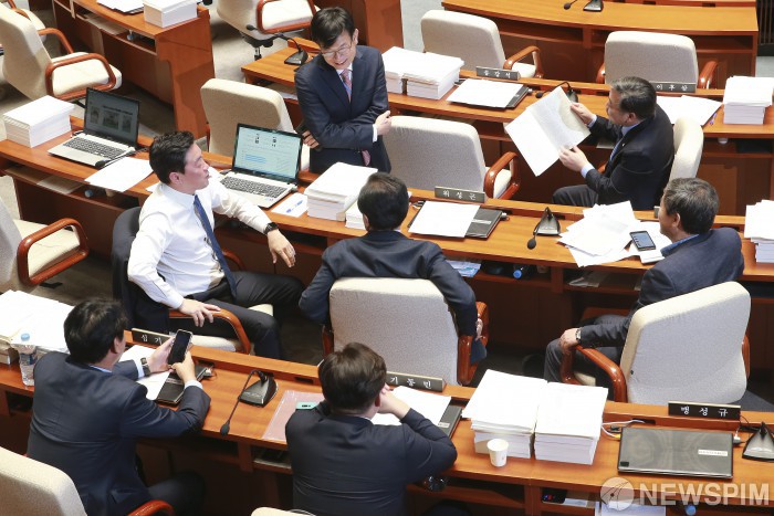 [서울=뉴스핌] 이형석 기자 = 김상조 청와대 정책실장이 6일 오후 서울 여의도 국회에서 제12차 예산결산특별위원회를 앞두고 더불어민주당 의원들과 대화를 나누고 있다. 2019.11.06 leehs@newspim.com