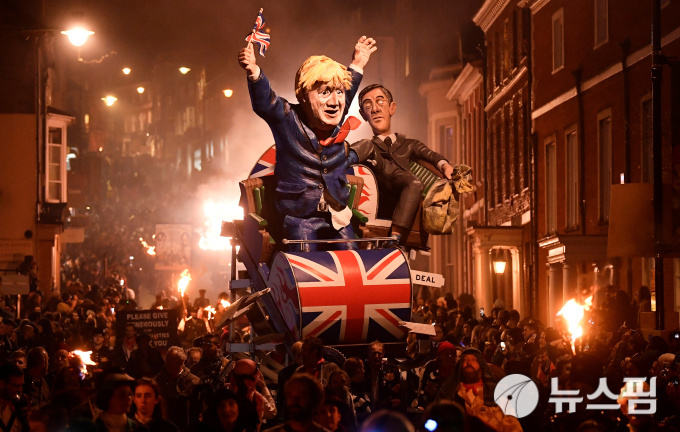 | [루이스 로이터=뉴스핌] 백지현 기자 = 5일(현지시간) 영국 루이스에서 열린 '본파이어 나이트' 행사에 보리스 존슨 영국 총리와 제이콥 리스 모그 보수당 하원 원내대표를 본따 만든 모형이 등장했다. 2019.11.06 lovus23@newspim.com |