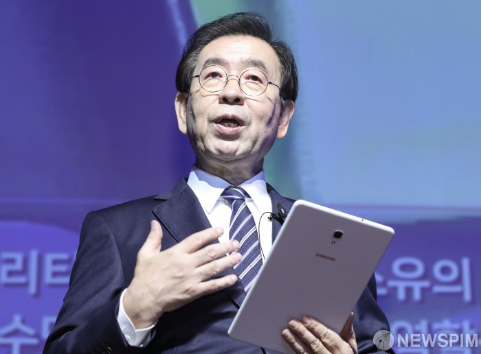 [서울=뉴스핌] 이한결 기자 = 박원순 서울시장이 8일 오후 서울 마포구 누리꿈스퀘어에서 열린 서울 스마트 모빌리티 엑스포 국제컨퍼런스 개회식에서 '케이로보'의 운반로봇 '앨리스 케이(K)'에게 받은 서울선언문을 읽고 있다. 2019.11.08 alwaysame@newspim.com