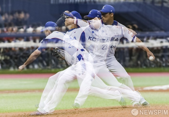 [서울=뉴스핌] 이한결 기자 = 8일 오후 서울 구로구 고척스카이돔에서 2019 WBSC 프리미어12 예선라운드 C조 대한민국과 쿠바의 경기가 펼쳐지고 있다. 5회초 두번째 투수 차우찬이 역투하고 있다. 2019.11.08 alwaysame@newspim.com