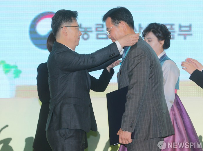 [세종=뉴스핌] 윤창빈 기자 = 김현수 농림축산식품부 장관이 11일 오전 세종시 정부세종컨벤션센터에서 열린 제24회 농업인의 날 기념식에서 은탑산업훈장을 수여하고 있다. 2019.11.11 pangbin@newspim.com