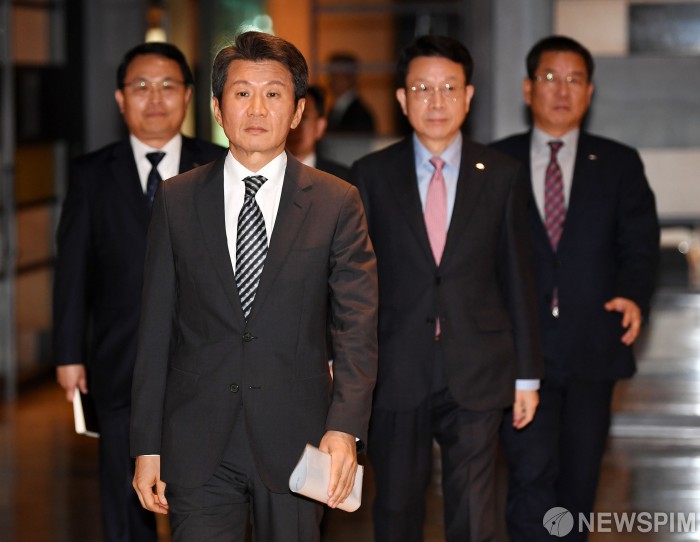 [서울=뉴스핌] 백인혁 기자 = 아시아나 항공 인수 우선협상대상자 선정 관련 정몽규 현대산업개발 회장이 입장을 발표하기 위해 12일 오후 서울 용산구 현대산업개발 본사 대회의실에 마련된 기자회견장으로 향하고 있다. 왼쪽부터 유병규 현대산업개발 부사장, 정 회장, 김대철, 권순호 현대산업개발 대표이사. 2019.11.12 dlsgur9757@newspim.com