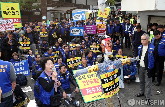 [서울=뉴스핌] 정일구 기자 = 5.18역사왜곡처벌농성단이 12일 오후 서울 서대문구 연희동 전두환 전 대통령 자택 앞에서 5·18 진상자백 촉구 집회를 열고 구호를 외치고 있다. 2019.11.12 mironj19@newspim.com