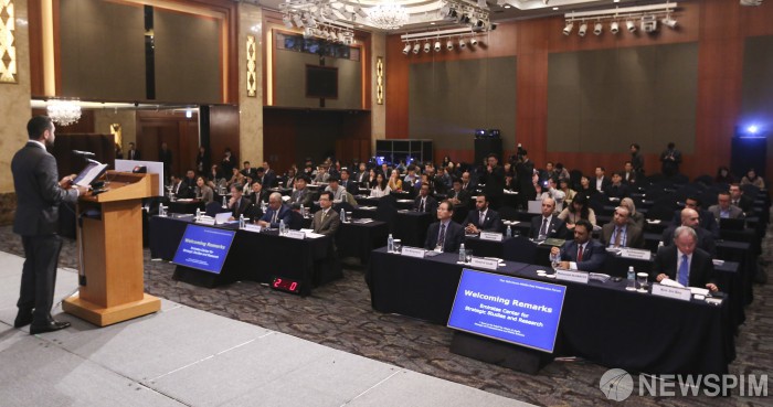 [서울=뉴스핌] 이한결 기자 = 오바이드 알 자비(Obaid Al Zaabi) 에미리트전략문제연구소 대외협력부장이 13일 오전 서울 중구 롯데호텔 서울에서 열린 '제16차 한-중동 협력포럼'에서 환영사를 하고 있다. 2019.11.13 alwaysame@newspim.com