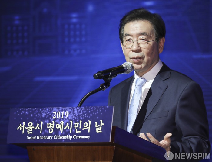 [서울=뉴스핌] 이한결 기자 = 박원순 서울시장이 13일 오후 서울 중구 서울시청에서 열린 '2019 서울시 명예시민의 날' 행사에서 환영사를 하고 있다. 2019.11.13 alwaysame@newspim.com