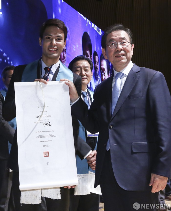 [서울=뉴스핌] 이한결 기자 = 박원순 서울시장이 13일 오후 서울 중구 서울시청에서 열린 '2019 서울시 명예시민의 날' 행사에서 외국인들에게 명예시민증을 수여하고 있다. 2019.11.13 alwaysame@newspim.com