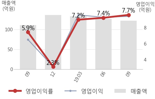 같은 기간, 매출은 -14억원(-10.3%) 감소하였고, 영업이익은 6억 3천만원(203.9%) 증가하였기 때문에 매출 감소과 영업이익 증가가 맞물려 지속적인 영업이익률 상승이 나타났다.