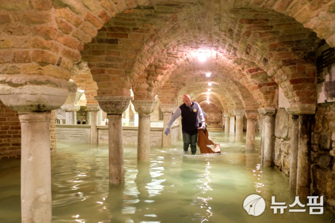| [베네치아 로이터=뉴스핌] 이홍규 기자 = 한 남성이 침수된 이탈리아 베네치아 산마르코 대성당 지하실을 걷고 있다. 2019.11.13 bernard0202@newspim.com |