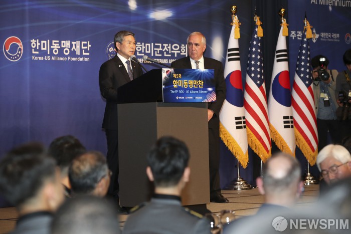 [서울=뉴스핌] 사진공동취재단 = 정경두 국방부 장관이 14일 오후 서울 중구 밀레니엄 힐튼 서울에서 열린 '제5회 한미동맹만찬' 행사에서 환영사를 하고 있다. 2019.11.14 photo@newspim.com