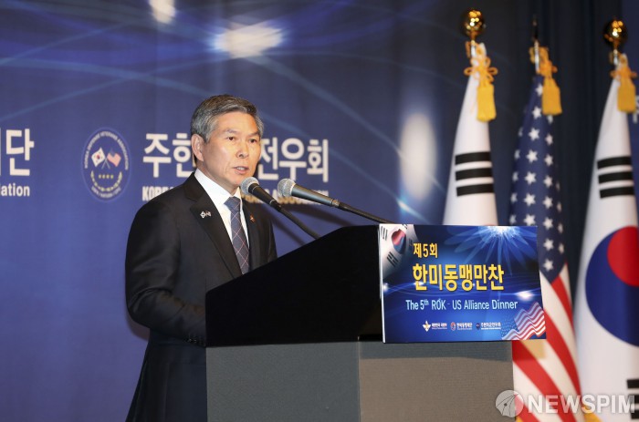 [서울=뉴스핌] 사진공동취재단 = 정경두 국방부 장관이 14일 오후 서울 중구 밀레니엄 힐튼 서울에서 열린 '제5회 한미동맹만찬' 행사에서 환영사를 하고 있다. 2019.11.14 photo@newspim.com