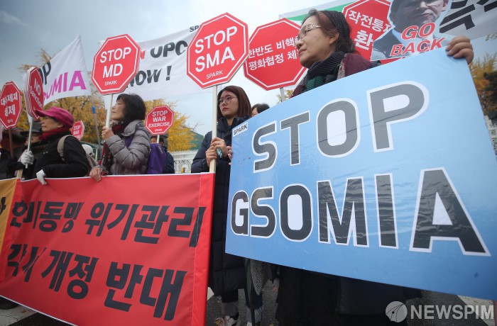 [서울=뉴스핌] 윤창빈 기자 = 15일 오전 서울 용산국 국방부 앞에서 평화와통일을여는사람들 회원들이 제51차 한미안보협의회의(SCM) 대응 기자회견을 열고 피켓을 들고 있다. 2019.11.15 pangbin@newspim.com