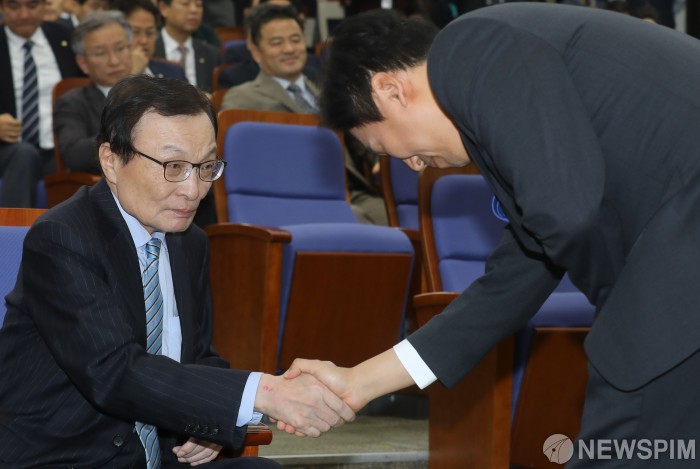 [서울=뉴스핌] 최상수 기자 = 이해찬 더불어민주당 대표가 18일 오후 서울 여의도 국회에서 열린 의원총회에서 손금주 의원과 악수를 나누고 있다. 2019.11.18 kilroy023@newspim.com