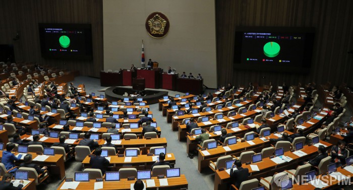 [서울=뉴스핌] 최상수 기자 = 19일 오후 서울 여의도 국회에서 열린 본회의에서 소방공무원법 전부개정법률안이 통과되고 있다. 2019.11.19 kilroy023@newspim.com