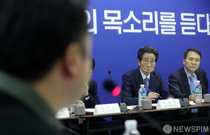 [서울=뉴스핌] 정일구 기자 = 이목희 일자리위원회 부위원장이 19일 오후 서울 금천구 디자인 주도 제품개발지원센터에서 열린 제13차 일자리위원회 사전 현장간담회에서 현장목소리를 청취하고 있다. 2019.11.19 mironj19@newspim.com