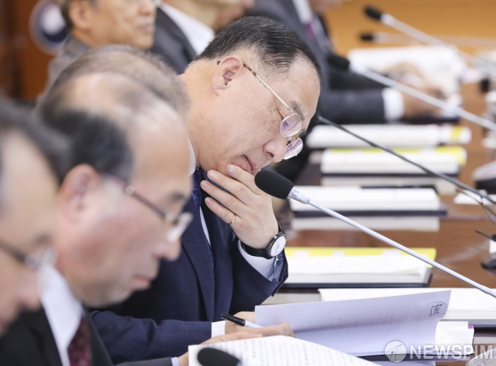 [서울=뉴스핌] 이한결 기자 = 홍남기 부총리 겸 기획재정부 장관이 20일 오전 서울 종로구 정부서울청사에서 열린 '국토정책위원회'에서 자료를 살피고 있다. 2019.11.20 alwaysame@newspim.com