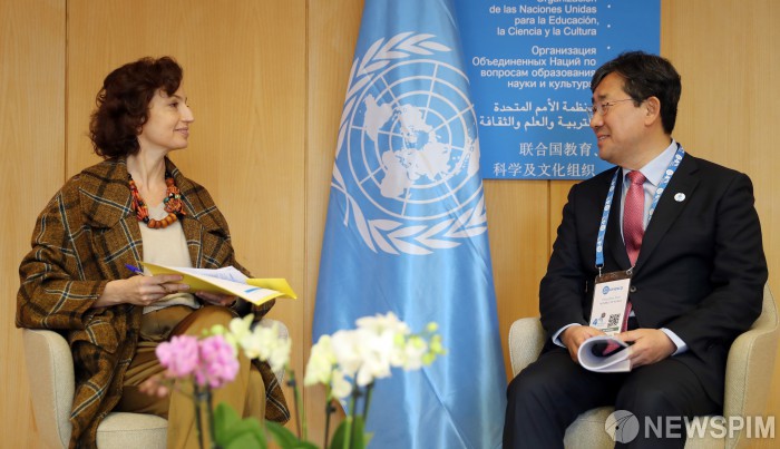 [파리=뉴스핌] 이현경 기자 = 박양우 문화체육관광부 장관(오른쪽)이 19일 유네스코 문화장관회의가 열리고 있는 프랑스 파리 유네스코 본부에서 오드레 아줄레(Audrey Azoulay) 유네스코 사무총장과 면담을 하고 있다. [사진=문체부] 2019.11.19 89hklee@newspim.com